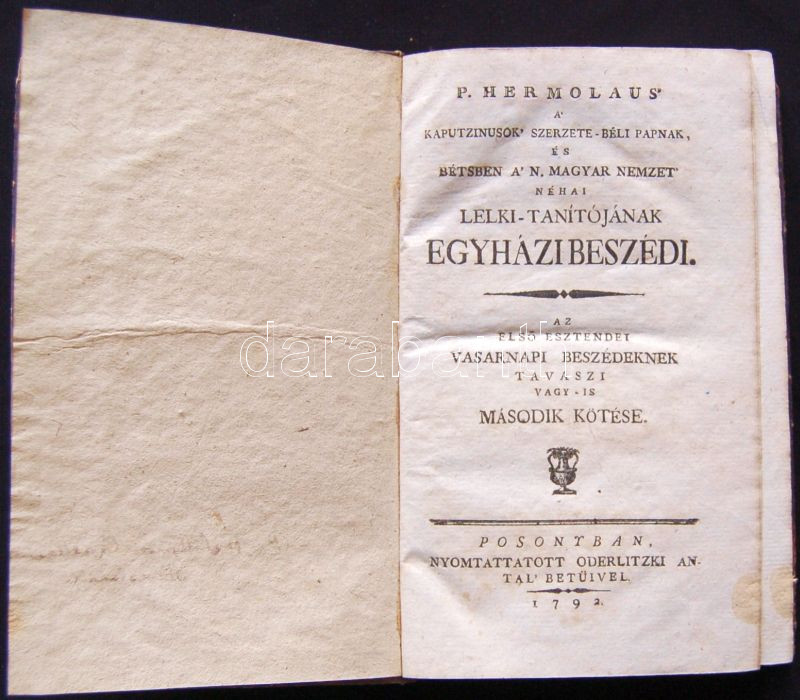 Móré György: P. Hermolaus a kaputzinusok szerzete-béli papnak, és Bétsben a n. magyar nemzet néhai lelki-tanítójának egyházi - beszédei. Pozsonyban, 1794. Patzkó Ferentz betűivel. Korabeli papírkötésben, szép állapotban