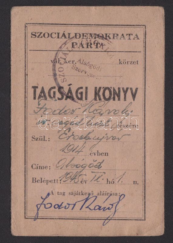 1945-1947 Szociáldemokrata Párt tagsági igazolvány tagsági bélyegekkel https://www.darabanth.com/de/148-Fernauktion/148.0/Andere-Sammelgebiete/Dokument~500017/1945-1947-Szocialdemokrata-Part-tagsagi-igazolvany-tagsagi-belyegekkel~II437107
