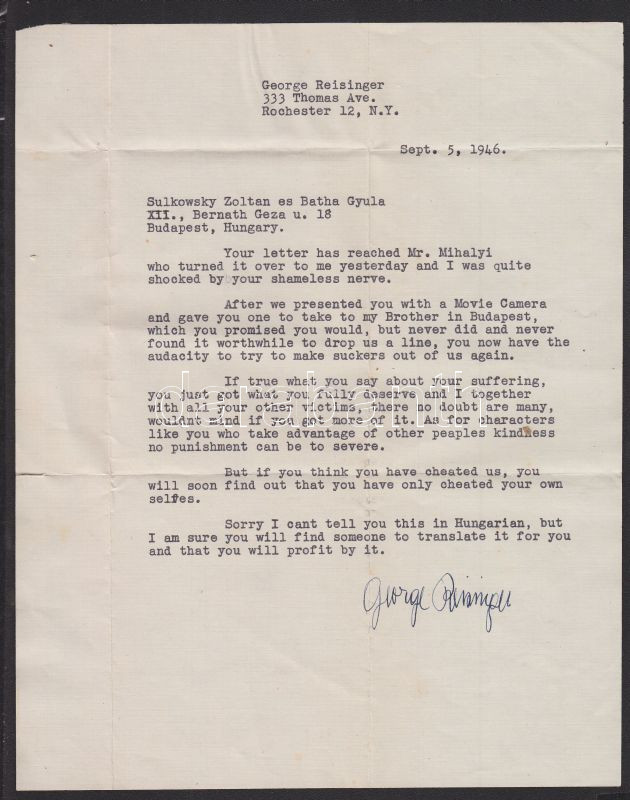 Beschreibung: 1946 A Sulkowszky-Bartha világ körüli motorosoknak szóló, érdekes témájú levél Mihályi József fényképészeti műszerész megbízásából írva.