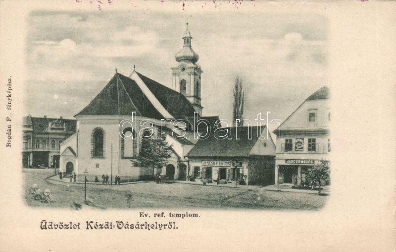 Kézdivásárhely Evangelist church with the shops of the Jancsó brothers https://www.darabanth.com/de/148-Fernauktion/148.0/Ansichtskarten/Siebenburgen~500006/Kezdivasarhely-Evangelist-church-with-the-shops-of-the-Jancso-brothers~II445376