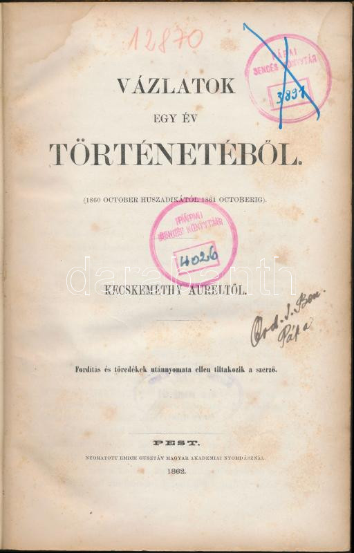 1862 Kecskeméthy Aurel: Vázlatok egy év történetéből (1860. október 20-1861. október), a magyar országgyűlés egyéni eseményei, érdekes történelmi dokumentum