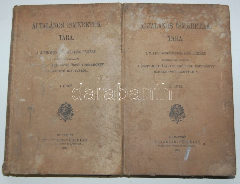 A Magyar Királyi Csendőrségi Zsebkönyv Szerkesztő Bizottsága: Általános ismeretek tára a M. kir. csendőrlegénység részére I-II. kötet. Bp., 1908 Franklin. Egészvászon kötésben, (a kötés kissé megviselt, de belül jó állapotban)