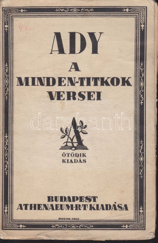 Ady Endre: Minden titkok versei, Athenaeum, Budapest 1923, borító: Koz... https://www.darabanth.com/de/149-Fernauktion/149.0/Andere-Sammelgebiete/Bucher-Sonstige-Raritaten~215/Ady-Endre-Minden-titkok-versei-Athenaeum-Budapest-1923-borito-Kozma-Lajos-apro-gerinc-hiba~II397364