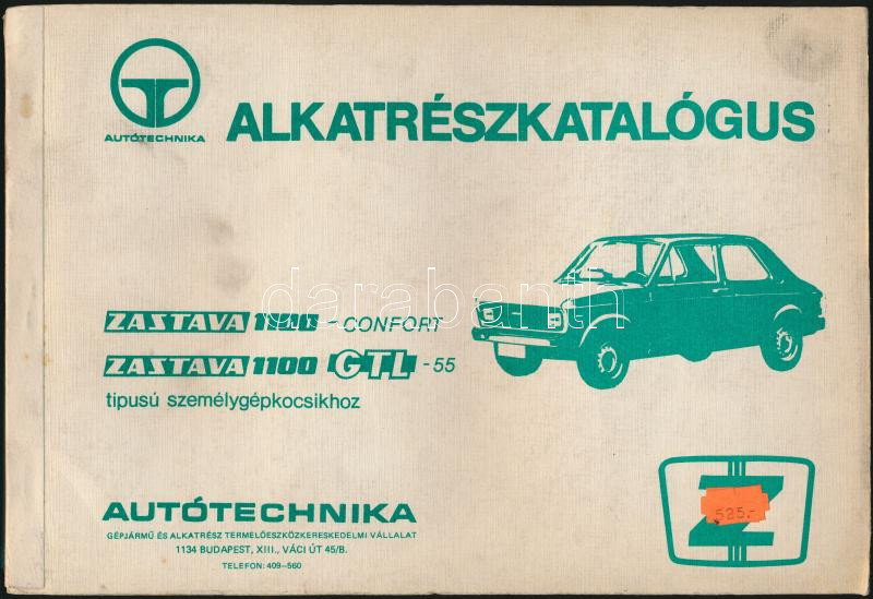 Alkatrészkatalógus Zastava 1100 és Zastava 1100 GTL típusú személygépkocsikhoz részletes műszaki rajzokkal és adatokkal, au Autótechnika Gépjármű és alkatrésztermelési Termelőeszközkereskedelmi Vállalat kiadásában, szép állapotban