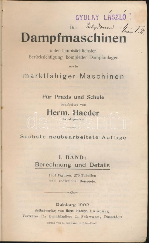 Dampfmaschinen I. - Gőzgépek rengeteg képpel és ábrával. Duisburg 1902... https://www.darabanth.com/de/149-Fernauktion/149.0/Andere-Sammelgebiete/Bucher-Sonstige-Raritaten~215/Dampfmaschinen-I--Gozgepek-rengeteg-keppel-es-abraval-Duisburg-1902-600p-kisse-kopott-eg~II453184