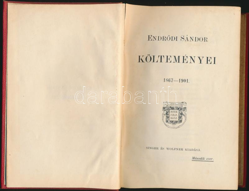 Endrődi Sándor költeményei 1867-1901. Singer és Wolfner. A költő arcké... https://www.darabanth.com/de/149-Fernauktion/149.0/Andere-Sammelgebiete/Bucher-Sonstige-Raritaten~215/Endrodi-Sandor-koltemenyei-1867-1901-Singer-es-Wolfner-A-kolto-arckepevel-diszitett-dom~II453853