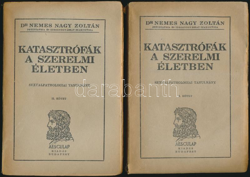 Nemes Nagy Zoltán: Katasztrófák a szerelmi életben, Sexualpathologiai tanulmány. I-II. kötet. Budapest, 1934. Aesculap. 236 p.; 232 p. A két kötet egységes, kiadói papírborítóban.