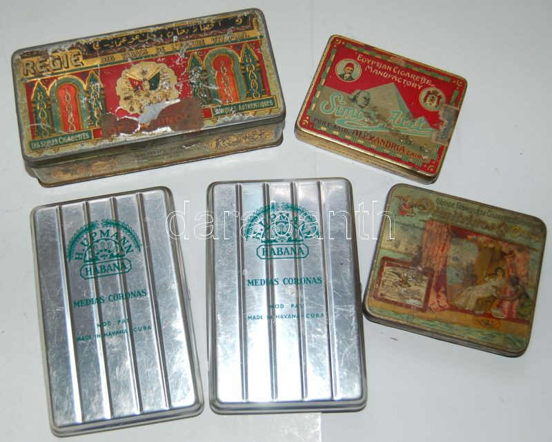 5 db régi fém szivaros és cigarettás doboz https://www.darabanth.com/de/149-Fernauktion/149.0/Andere-Sammelgebiete/Flohmarkt~600014/5-db-regi-fem-szivaros-es-cigarettas-doboz~II450353