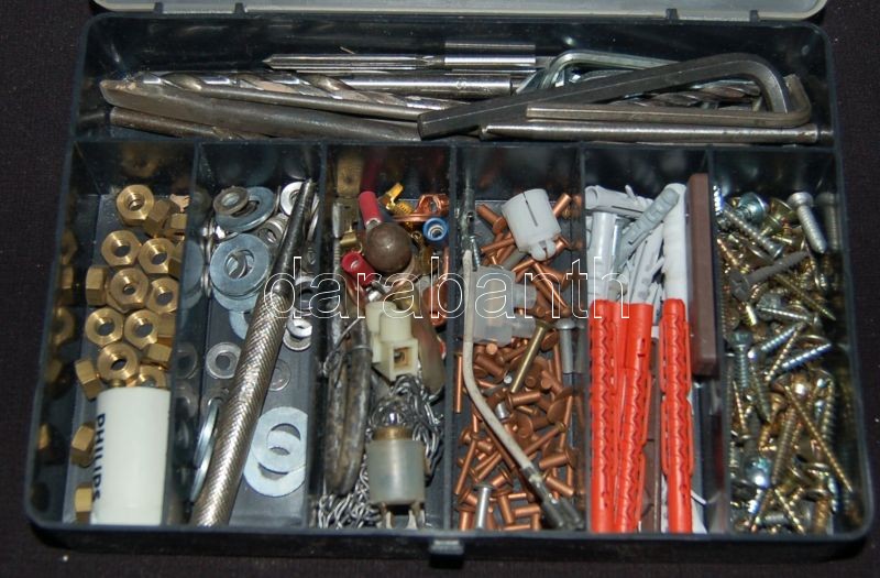 Beschreibung: Hatalmas barkács tétel: fúrószárak, imbuszkulcsok, foglalatok, kapcsolók, csavarok, tiplik, menetvágó, stb.