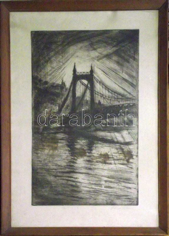 Beschreibung: Szőnyi István (1894-1960): Erzsébet-híd, rézkarc-papír, ceruzával jelzett, keretben 43x64 cm