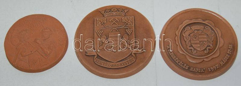 Beschreibung: 3 db kerámia plakett: "Históriás napok `96 Sárvár", "A megbékélés napja 1997 Dorog", Kesztölc