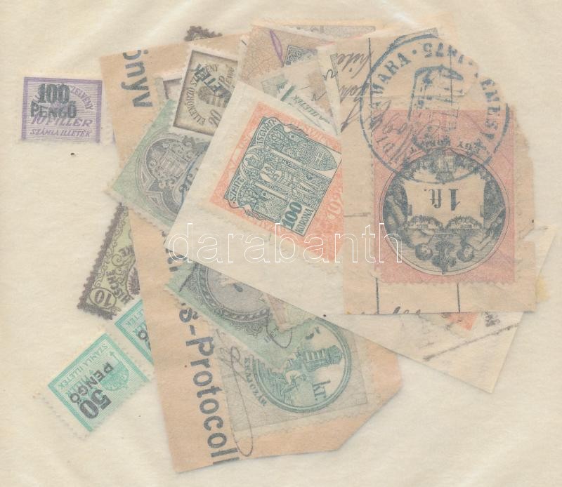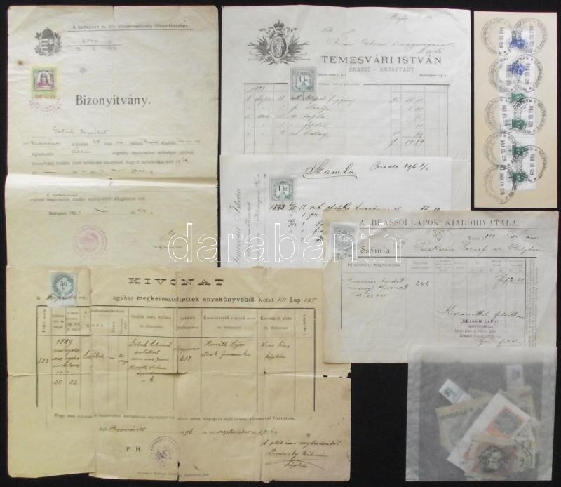 Beschreibung: 66 db okmánybélyeg, ebből 11 db okmányon