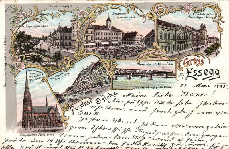 Beschreibung: 1898 Eszék with synagogue litho (small tear)
