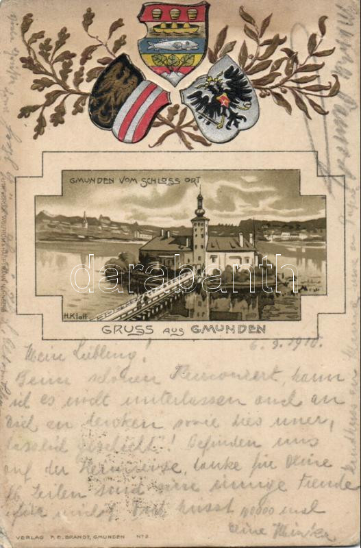 Gmunden, coat of arms Emb. litho s: Klatt (fl) https://www.darabanth.com/de/149-Fernauktion/149.0/Ansichtskarten/Osterreich~600018/Gmunden-coat-of-arms-Emb-litho-s-Klatt-fl~II453529