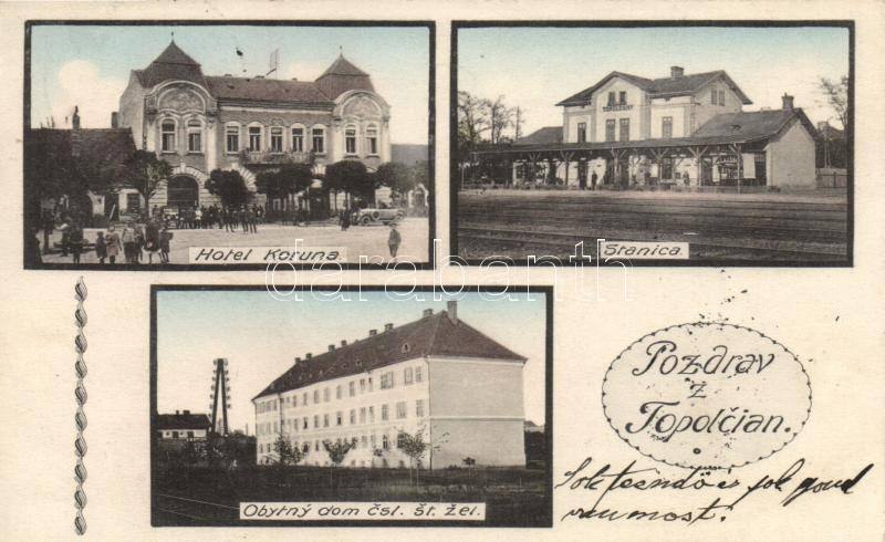 Nagytapolcsány with Hotel Korona and railway station https://www.darabanth.com/de/149-Fernauktion/149.0/Ansichtskarten/Slowakei~600007/Nagytapolcsany-with-Hotel-Korona-and-railway-station~II452783