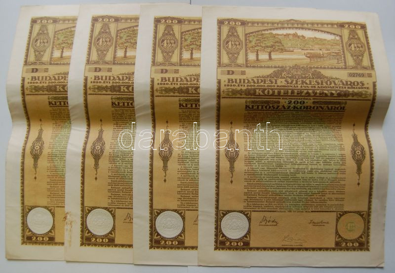 1920. 4db "Budapest Székesfőváros" kötelezvénye 200K-ról szelvényekkel... https://www.darabanth.com/de/149-Fernauktion/149.0/Numismatik/Aktien-Wertpapieren-und-Tickets~600098/1920-4db-Budapest-Szekesfovaros-kotelezvenye-200K-rol-szelvenyekkel-magyar-es-nemet-nyel~II453980