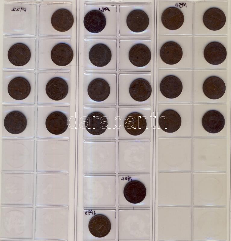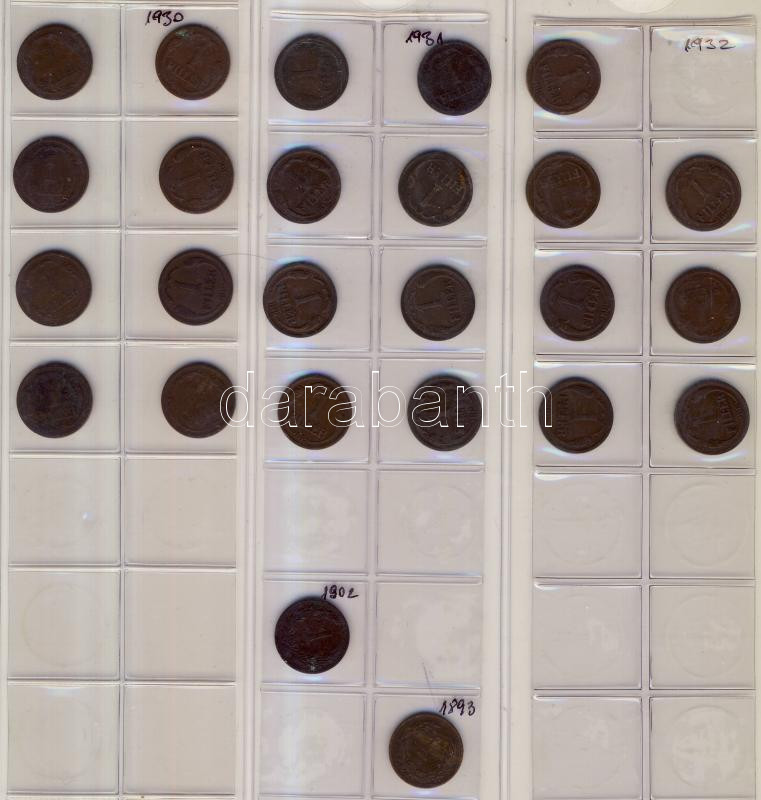 Beschreibung: 1893. 1f + 1902. 1f + 1926. 1f (10x) + 1927. 1f (11x) + 1928. 1f (14x) + 1930. 1f (8x) + 1931. 1f (8x) + 1932. 1f (7x) + 1933. 1f (12x) + 1934. 1f (9x) + 1935. 1f (7x) + 1936. 1f (9x) + 1938. (7x) ,összesen 104db! 4db berakólapon T:vegyes