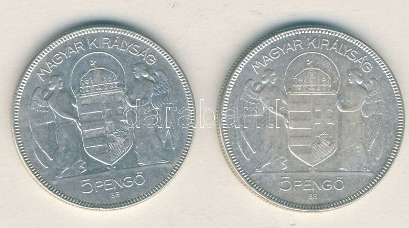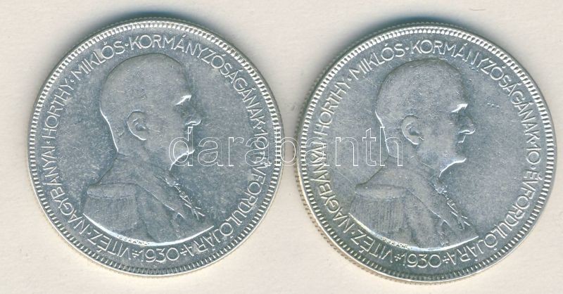 1930. 5P Ag "Horthy jobbra" (2x) T:2/2- https://www.darabanth.com/de/149-Fernauktion/149.0/Numismatik/Ungarische-Munzen~600101/1930-5P-Ag-Horthy-jobbra-2x-T22-~II451064