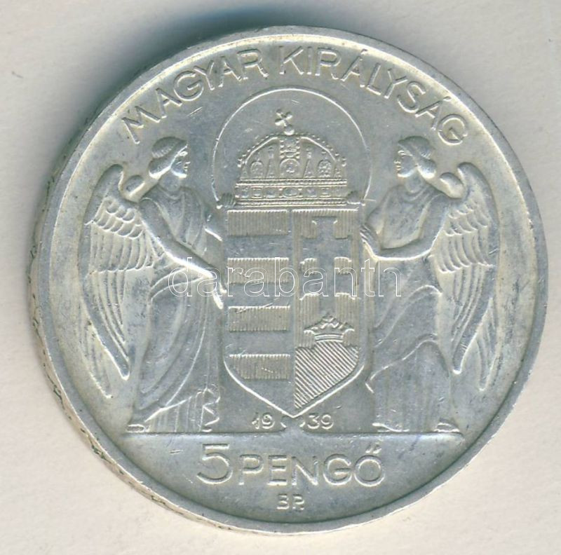 1939. 5P Ag "Horthy - balra" T:2- https://www.darabanth.com/de/149-Fernauktion/149.0/Numismatik/Ungarische-Munzen~600101/1939-5P-Ag-Horthy--balra-T2-~II450676