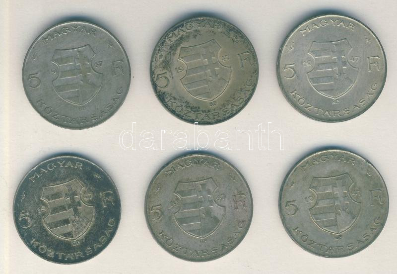 1947. 5Ft Ag "Kossuth" (6x) T:2,2-,3 patina https://www.darabanth.com/de/149-Fernauktion/149.0/Numismatik/Ungarische-Munzen~600101/1947-5Ft-Ag-Kossuth-6x-T2-2-3-patina~II450648