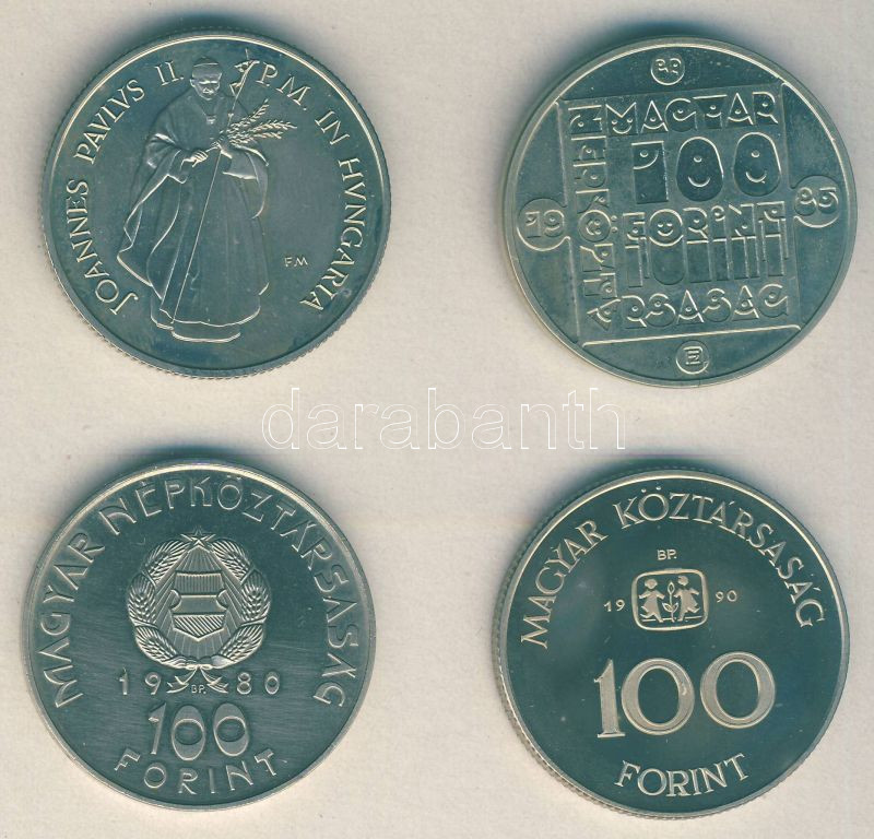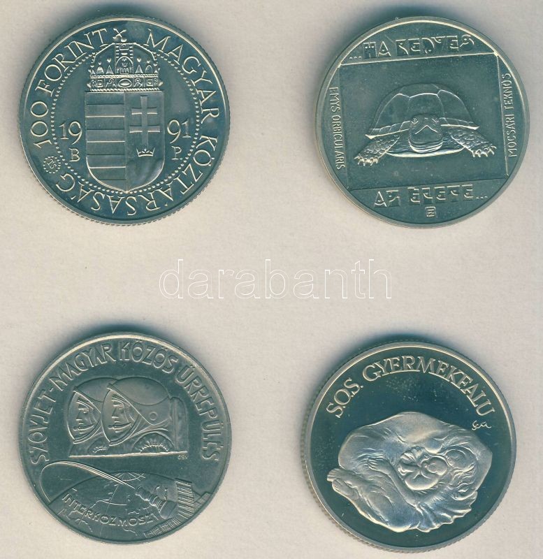 Beschreibung: 1980. 100Ft "Szovjet-magyar közös űrrepülés" T:BU + 1985. 100Ft Ag "Természetvédelem-mocsári teknős" T:BU + 1990. 100Ft "SOS Gyermekfalu" T:PP + 1991. 100Ft "II.János Pál pápa látogatása" T:BU