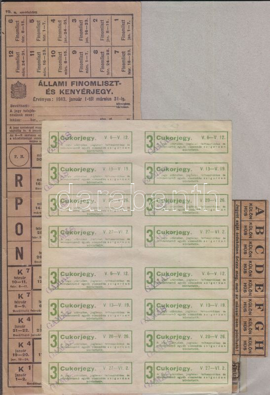 1943. Állami finomliszt és kenyérjegy + Budapesti húsjegy + cukorjegy https://www.darabanth.com/de/149-Fernauktion/149.0/Numismatik/Ungarusche-und-Auslandische-Notgelden~600099/1943-Allami-finomliszt-es-kenyerjegy-plus-Budapesti-husjegy-plus-cukorjegy~II450294