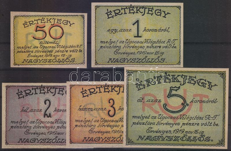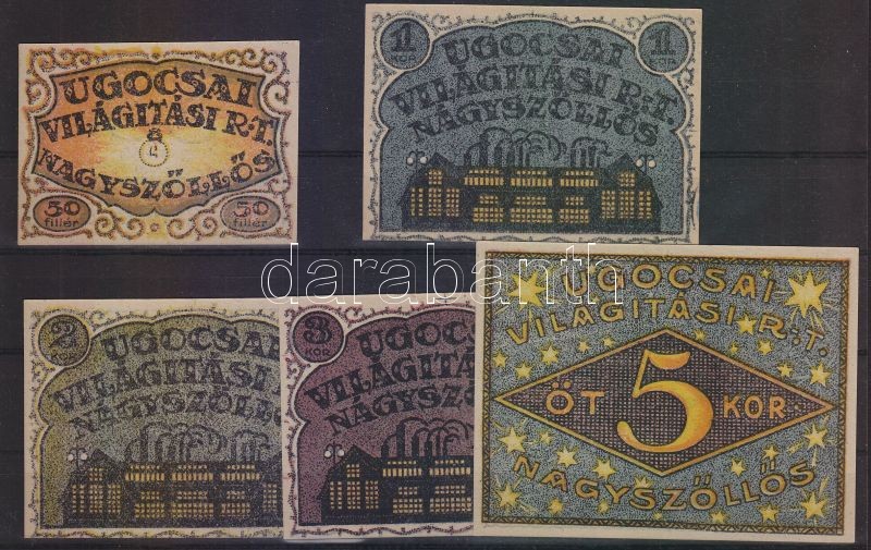 Nagyszőllős 1919. "Ugocsai Világítási Rt." 50f, 1K, 2K, 3K, 5K T:I https://www.darabanth.com/de/149-Fernauktion/149.0/Numismatik/Ungarusche-und-Auslandische-Notgelden~600099/Nagyszollos-1919-Ugocsai-Vilagitasi-Rt-50f-1K-2K-3K-5K-TI~II451717