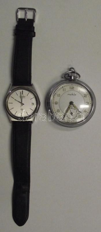Beschreibung: 1db működőképes naptáras ffi Seiko márkájú kvarcóra és 1db Ruhla márkájú ffi zsebóra