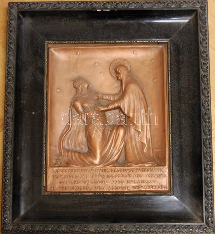 Beschreibung: Bakonyi 1929 jelzéssel: Oltalmazó Szűz Mária és Hungária réz kisplasztika, könyörgő ima szövegével keretben / St. Mary and Hungaria 40x50 cm