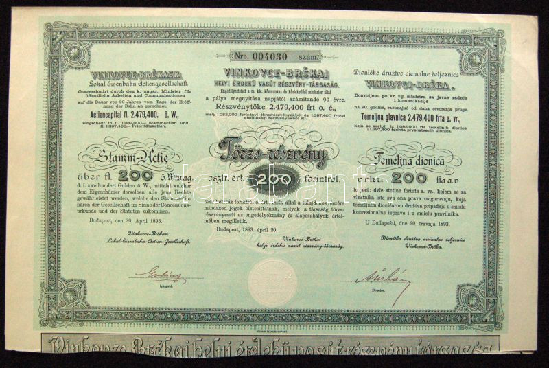 1893. "Vinkovce-Brckai Helyi Érdekű Vasút Részvény-Társaság" Törzs-részvénye 200Ft-ról szelvényekkel és szárazpecséttel,német/magyar/horvát nyelven /