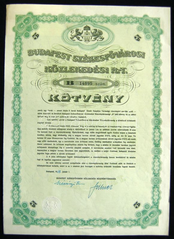 1948. "Budapest Székesfővárosi Közlekedési Rt." kötvénye 1 szelvénnyel... https://www.darabanth.com/de/150-Fernauktion/150.0/Numismatik/Aktien-Wertpapieren-und-Tickets~6/1948-Budapest-Szekesfovarosi-Kozlekedesi-Rt-kotvenye-1-szelvennyel-es-szarazpecsettel~II455562