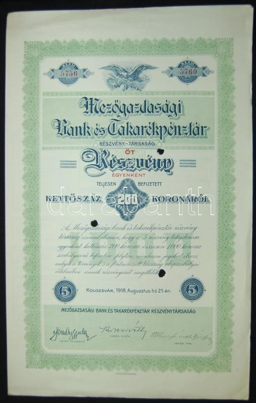 Kolozsvár 1918. "Mezőgazdasági Bank és Takarékpénztár" részvénye 200K-... https://www.darabanth.com/de/150-Fernauktion/150.0/Numismatik/Aktien-Wertpapieren-und-Tickets~6/Kolozsvar-1918-Mezogazdasagi-Bank-es-Takarekpenztar-reszvenye-200K-rol-szelvenyekkel-l~II455318