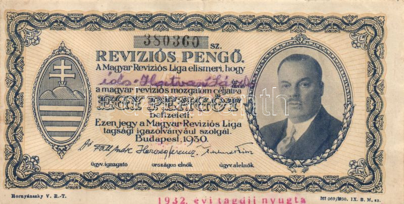 Beschreibung: Budapest 1930. "Reviziós pengő" arcképes változat T:II/II-