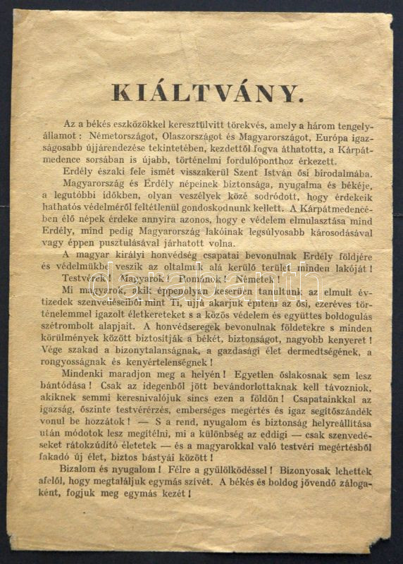 1940 Röplap a lakosságnak Erdély visszatérése alkalmából, a békés mego... https://www.darabanth.com/de/151-Fernauktion/151.0/Andere-Sammelgebiete/Historische-Dokumenten-Handschriften~500005/1940-Roplap-a-lakossagnak-Erdely-visszaterese-alkalmabol-a-bekes-megoldas-hirdetesevel~II464950