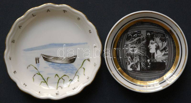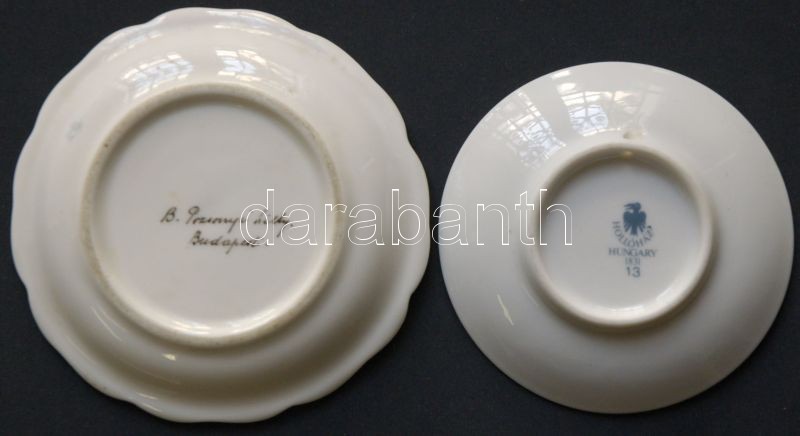 Beschreibung: Szász Endre által tervezett Hollóházi jelzett (d:8cm) és egy kézzel festett jelzés nélküli porcelán kistányér (d:9cm)