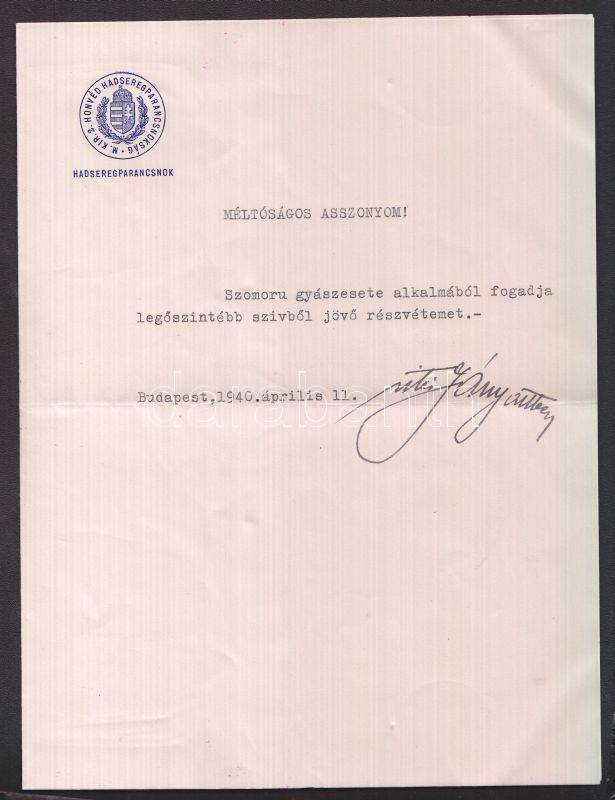 Beschreibung: 1940 Jány Gusztáv tábornok aláírása részvét nyilvánító levélen