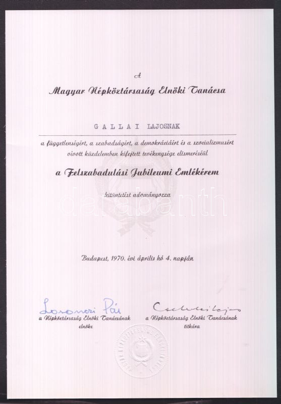 1970 Felszabadulási Jubileumi emlékérem adományozó oklevél Losonczi Pá... https://www.darabanth.com/de/151-Fernauktion/151.0/Andere-Sammelgebiete/Signatur~500006/1970-Felszabadulasi-Jubileumi-emlekerem-adomanyozo-oklevel-Losonczi-Pal-alairasaval-es-e~II461012