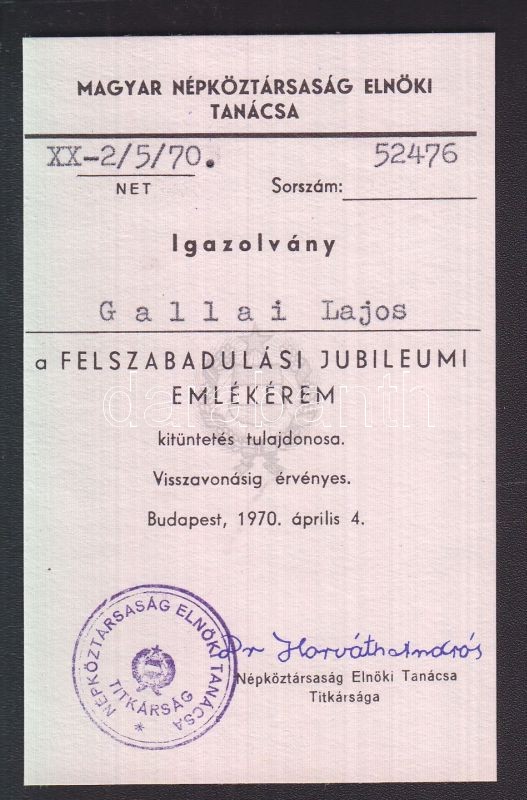 Beschreibung: 1970 Felszabadulási Jubileumi emlékérem adományozó oklevél Losonczi Pál aláírásával és egy igazolvány