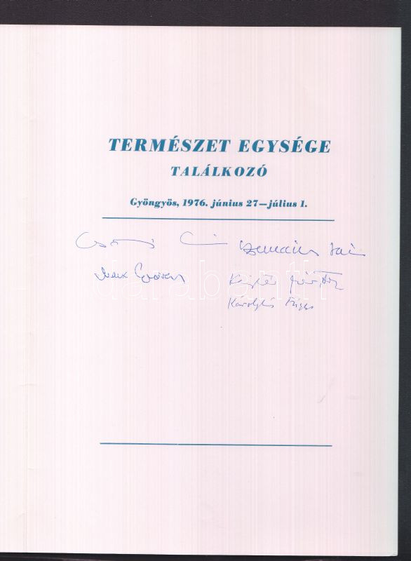 1976 Természet egysége találkozó emléklap tudósok aláírásával: Csányi Vilmos biológus, Marx György atomfizikus, Kajtár Márton kémikus, Károlyházi Frigyes fizikus