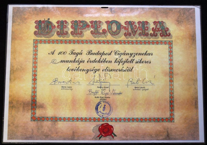 Beschreibung: cca 1995 100 tagú Cigányzenekari Diploma Boros Lajos prímáskirály aláírásával 30x42 cm