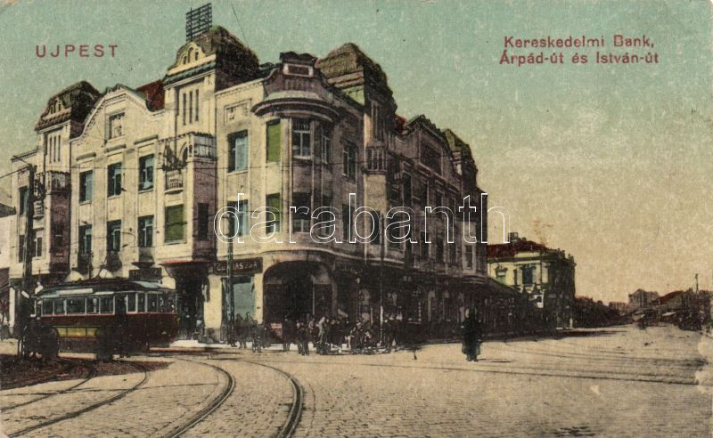 Budapest IV. Újpest Kereskedelmi Bank villamossal https://www.darabanth.com/de/151-Fernauktion/151.0/Ansichtskarten/Ungarn~500034/Budapest-IV-Ujpest-Kereskedelmi-Bank-villamossal~II461047