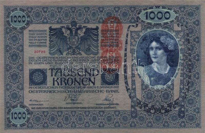 1902. 1000K függőleges "Deutschösterreich" felülnyomással T:I https://www.darabanth.com/de/151-Fernauktion/151.0/Numismatik/Ungarische-Banknoten~500151/1902-1000K-fuggoleges-Deutschosterreich-felulnyomassal-TI~II460384