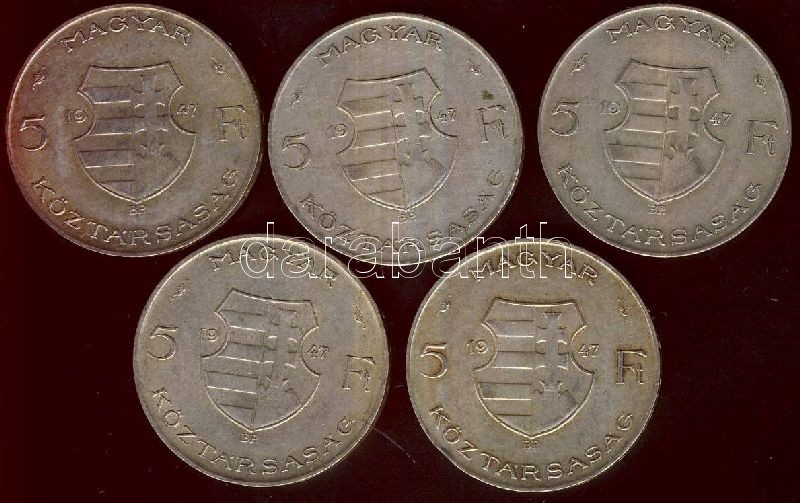 1947. 5Ft Ag "Kossuth" (5x) T:2-,3 ph. https://www.darabanth.com/de/151-Fernauktion/151.0/Numismatik/Ungarische-Munzen~500152/1947-5Ft-Ag-Kossuth-5x-T2-3-ph~II460503