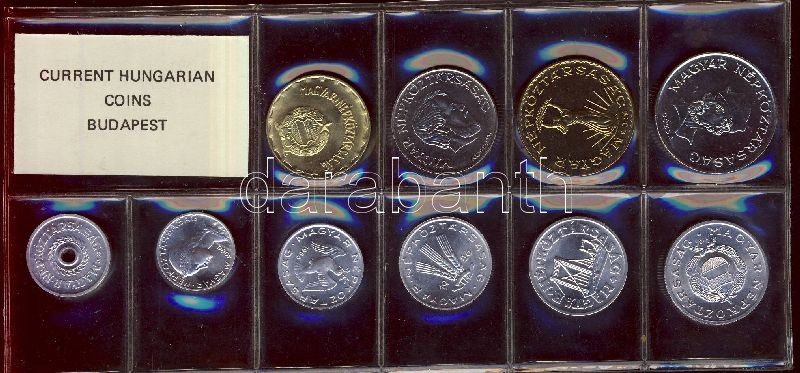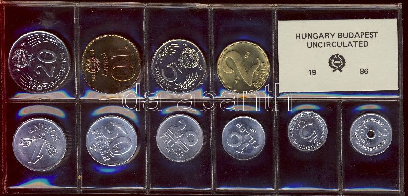 1986. 2f-20Ft 9db klf érmés forgalmi sor fóliatokban T:1 https://www.darabanth.com/de/151-Fernauktion/151.0/Numismatik/Ungarische-Munzen~500152/1986-2f-20Ft-9db-klf-ermes-forgalmi-sor-foliatokban-T1~II464018