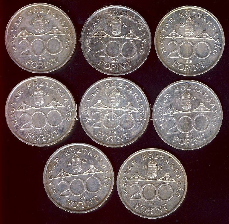 1992. 200Ft Ag "MNB" (8x) T:2+,2 https://www.darabanth.com/de/151-Fernauktion/151.0/Numismatik/Ungarische-Munzen~500152/1992-200Ft-Ag-MNB-8x-T2plus-2~II461820
