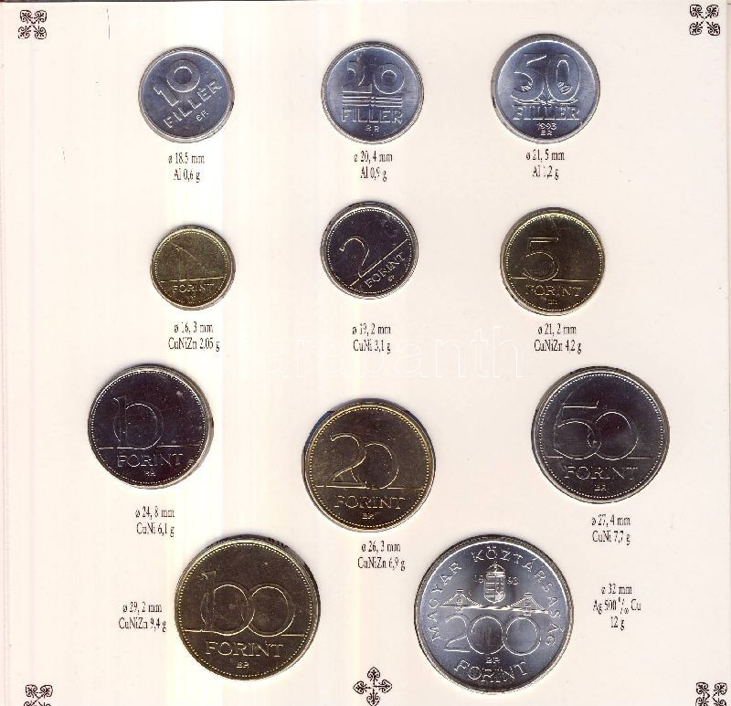 Beschreibung: 1993. 10f-200Ft 11klf db "lapozós" szettben, benne 200Ft Ag "MNB" T:BU