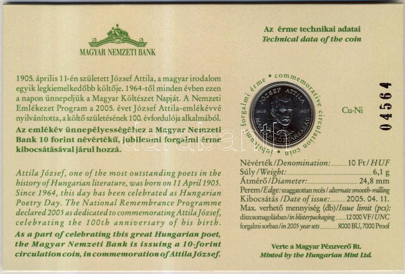 Beschreibung: 2005. 10Ft "József Attila" számozott emléklapon T:1 Csak 12000db!