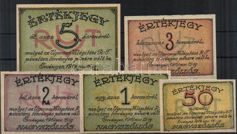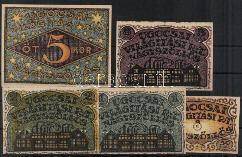 Nagyszőllős 1919. "Ugocsai Világítási Rt." 50f, 1K, 2K, 3K, 5K T:I https://www.darabanth.com/de/151-Fernauktion/151.0/Numismatik/Ungarusche-und-Auslandische-Notgelden~500150/Nagyszollos-1919-Ugocsai-Vilagitasi-Rt-50f-1K-2K-3K-5K-TI~II460437