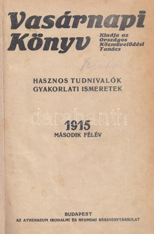 1915/2. Vasárnapi Könyv - Hasznos tudnivalók, gyakorlati ismeretek, At... https://www.darabanth.com/de/152-Fernauktion/152.0/Andere-Sammelgebiete/Bucher-Sonstige-Raritaten~246/19152-Vasarnapi-Konyv--Hasznos-tudnivalok-gyakorlati-ismeretek-Athenaeum-Nyomda-Bp-kiado~II469895