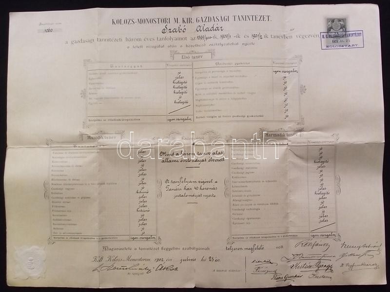 Beschreibung: 1902 Kolozs-monostori M. Kir. Gazdasági Tanintézet végbizonyítványa illetékbélyeggel és aláírásokkal